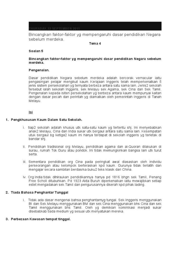 Sekolah vernakular melayu pada tahun 1856. Bandingkan kesan pendidikan kepada pembangunan insan dan negara antara pendidikan dalam era sebelum merdeka dengan pendidikan dalam era selepas merdeka. Selepas zaman kemerdekaan, sistem pendidikan ini telah ditukar kepada sistem yang telah dirangka oleh penyata razak. (5) kurangnya pergaulan antara pelajar melayu dan pelajar bukan melayu, terutama selepas waktu. Namun kini sekolah jenis ini dan sekolah kebangsaan dibiayai sepenuhnya oleh kementerian pelajaran malaysia dan dikira sebagai.